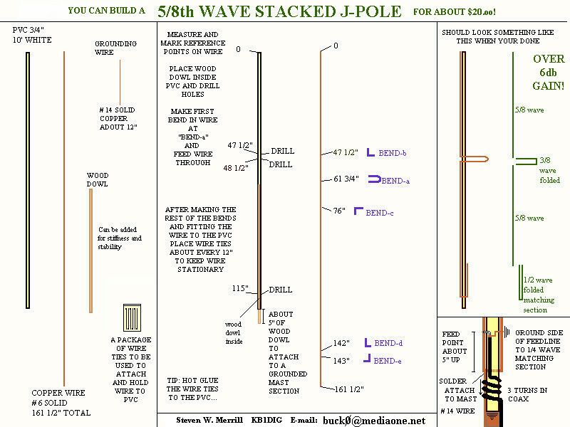 No Tim, the phasing stub needs to be 3/8 of a wave length because you need to bring the lower and upper elements into phase, that being 1 wavelength. The bigger issue is the mis-match of the 1/4 wave tuned stub feeding the 5/8 length element. J-poles are high impedance, end-fed 1/2 wave RESONANT antennas, and that’s why you can feed them with a 1/4 wave transmission line. 5/8 antennas are non-resonant antennas that have a significant out-of-phase current/voltage reflection, due to excess capacitance of the design; that’s why you always see a coil at the antenna feed-point. the J-pole transmission line design cannot get around that issue, and therefore, a transmission line matching device is not a good way to feed a 5/8 antenna. This antenna would be much better off being a double 1/2 wave antenna collinear antenna, with a coil phasing the upper and lower radiators. The coil would designed to be less than a 1/2 wave in length, because the inductance of the coil will also add to the phasing angle. This can be designed through experimenting with coils of various total wire lengths, and their calculated inductance, and adding the phase angle produced by that coil at a given frequency and using online inductance phasing angle calculators, so you get a total of 180 degrees of phase difference between the two ends of the coil. Keep in mind velocity factor of wire in the atmosphere, you can discount all wire lengths by about 4%.