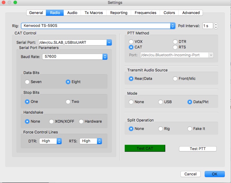 Configuration, required some changes on OSX settings, and a reboot, while the connection to my TS-590S required some tricks. I copied the settings from the RUMlog configuration, and it worked immediately.