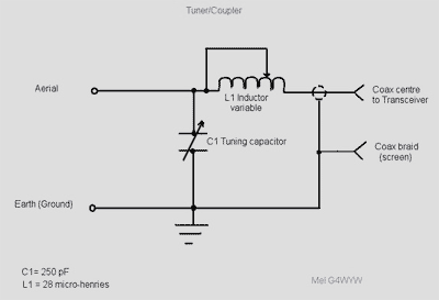 See the diagram for details of how to make a simple tuning device that should tune up any random length of end fed wire. Using low power, say 5 watts or less, then any tuning condenser which has vanes, removed from an AM Wireless, will do the trick. Just remember that the wider the gap between vanes, the higher the power it will handle.