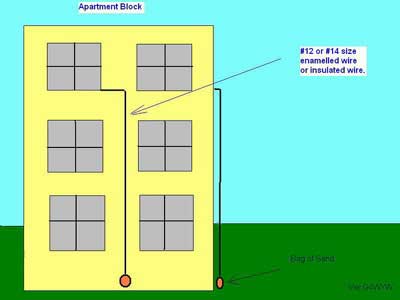 Choosing which of these two aerial methods to use will depend on how high in the apartment block you live. You could try both of them. The simplicity of this second way is that you can easily lower your wire, with a small canvas bag of sand as a weight at the bottom. This will keep your wire straight while you are lowering it and also keep the wire from swinging too and fro once it’s in the final position. You could also use a section of broom handle or similar with a V notch cut in one end to keep your wire away from the building structure. If you feel particularly paranoid, you can lower this when it gets dark, use it, then bring it back up before going to bed.