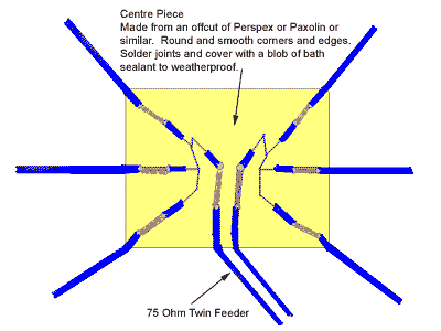 After you have ended up with pairs of wires, all cut to length ready for connecting to your centre piece, the next thing to do is to connect all the ends together and to the feeder.. Look at the enlarged diagram showing the centre-piece to understand how this is done. Basically, the end of each wire is passed through two holes, an overhand knot (one turn over the wire and through the loop) pulled tight will prevent the wire from being pulled out of the centre piece. Strip off about half an inch of insulation from each wire end after the knot has been tied and connect all the ends on one side of the connector centre piece and to this should be added one side of the 75 ohm Twin Feeder which is commonly used as telephone wire leading from telegraph poles to the house and which is a superb match when used as a feeder or Transmission Line for this aerial design.