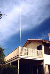 The 40m vertical in its down position rests along the bottom of the far side deck railing. It is supported by plastic coated hangers of the type sold in hardware stores for hanging bicycles, etc, on garage walls. These hangers also make excellent supports for the antenna in the intermediate position for extending the telescoping top section and for supporting the vertical in the upright position.