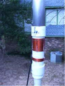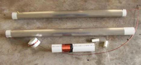 Install the top cylinder to the 2”PVC coupling with the Phasing Coil using PVC cement. The aluminium flashing should be against the coupling (we will cut the bottom cylinder PVC to get the correct spacing). Ensure that the end of the coil is lined up with the bolt. Scrape the enamel off the wire and install on the bolt. Put the bottom cylinder into the coupling for measurement. The two cylinders should be 1 diameter spacing ( 2 3/8”). After cutting the bottom cylinder to the correct dimensions, it is time to glue it into the coupling. The bolt on the bottom should be mounted 180 degrees from the bolt on the top cylinder. Measure the bottom end of the bottom cylinder and cut it off so the flashing is flush with the bottom coupling. Glue the coupling in place. Measure the pipe containing the tuning coil to the flashing for 1 diameter between the cylinder and the tuning coil. Cut the pipe and glue into place. Now we are ready to tune it.