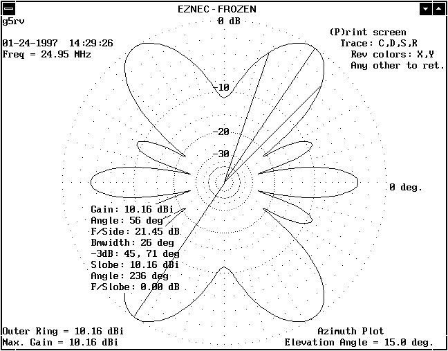 Because a wavelength is so long on 75 meters (about 260 feet) we can change the length of the antenna and 300 ohm twinlead slightly without having much of an effect. But on 10 meters, where a wavelength is only about 35 feet, slight changes in the lengths of elements can have a large effect, about seven times the effect that it has on 75 meters. This wavelength effect makes accurate preditions of how an antenna will respond more difficult as we go higher in frequency. If our G5RV is really 104 feet long instead of 102 feet long, we won’t detect much of a difference on 75 meters but we will definitely see a large difference on 10 meters. The standard G5RV has trouble on 30, 17, and 10 meters. On all the bands where it is a good antenna, it requires an antenna tuner.