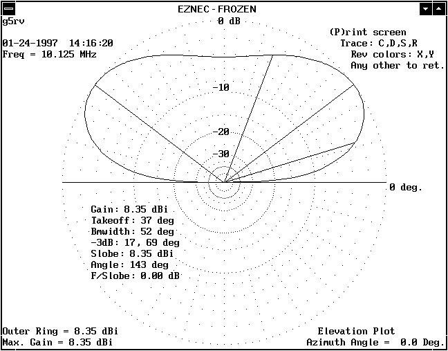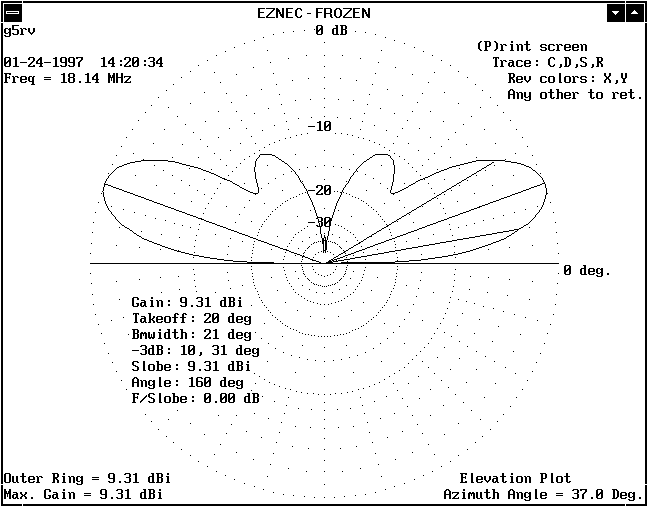 Let’s look at some of the characteristics of a horizontal 102 ft. center-fed dipole strung between two 37 ft. poles. The antenna runs North/South for the purpose of displaying radiation patterns. For now, we won’t worry about what kind of feedline conducts the RF power from the transmitter to the antenna. “Impedance” in the following chart indicates the antenna feedpoint impedance as predicted by EZNEC(R), an antenna modeling program. We will include one frequency per HF band with the knowlege that the antenna feedpoint impedance changes with any change in frequency. We will also list the predicted VSWR for 50 ohm coax, 300 ohm twinlead, and 450 ohm ladder-line. Radiation patterns can be observed by clicking on the band of operation.