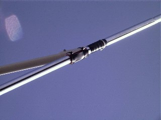 V element part is a fishing rod. We could not find pure glass fiber rods in Japan. A selling rod almost consists with some Carbon fiber. The rod I purchased, is 7.2m and consists with 37% of Carbon. I reinforced connecting points with cyano-acrylate glue and I covered the rods by aluminum tape with adhesive (width 75mm) longitudinally. Spiral taping is not so good.