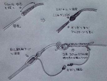 3mm*20cm CREMONA rope was added to a rod tip, 5cm of a 20cm rope end covered a rod tip and fixed with Epoxy bond and its base is shaped like a ball ( short pot life time (1-5 min) bond recommended .)  This is to prevent to never pull out the twisted enamel wire as mentioned next. Aluminum taping is stopped just it.  The diameter of using enameled wire is first 0.8 and now 1mm.  I remove enamel about 15cm of a 30cm wire and twisted it about 20times around the aluminum tape section of rod tip,  and wrapped with self adhesive sealing tape.  Bi-lateral end of Horizontal enameled wire is twisted with other two 20 cm enameled wires like as a picture.  Horizontal and rod tip wire is connected using terminal connector for a car electric circuit use.