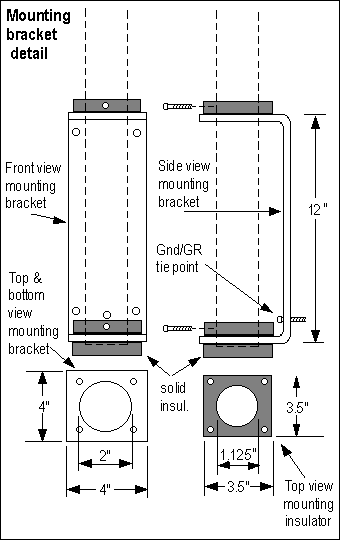 The mounting bracket shown here is made from a 3/16″ x 20½” x 4″ piece of 6061-T6 aluminum plate, bent as shown. There are three 3.5″ square insulators that are made of 3/8″ high UV resistant PVC (dark gray) flat stock. All three insulators have screw holes drilled in each corner that match the screw holes in the top and bottom of the mounting bracket (See Mounting Bracket detail) and two have a 1.125″ hole in its center to hold the internal support tubing which rests on the solid insulator at the bottom.