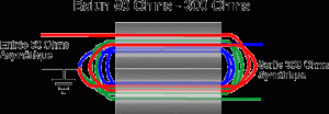 On commence par faire 2,5 spires (bleu), en partant du coté 300 Ohms. On raccorde l’autre extrémité à la masse, au niveau de la prise d’entrée. Ce sera d’ailleurs le point commun de masse. En partant de la masse, on rebobine à nouveau 2,5 spires de fil (vert) qui aboutira coté 300 ohms. Toujours à partir du point de masse, on rebobine à nouveau 2 spires (rouge) qui aboutira à la prise (PL) d’entrée.