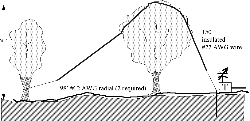 Some experimentation on the ideas above led me to take 150 feet of insulated #22 hookup wire and draw it through the crown of a cooperating oak tree: the tree is about 60 feet high. I used my fishing rod, monofilament line, a one-ounce lead ‘egg’ sinker, and a ‘wrist-rocket’ slingshot to put the line over the crown of the tree. By untying the lead weight at the far end (at ground level) and attaching nylon ‘chalk line,’ I was able to pull the chalk line over the tree back to the starting point.