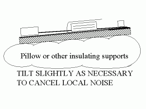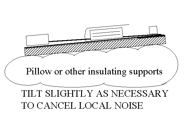 Now here’s the really neat part of Mike’s design – how to cancel noise. Put the antenna on some insulating support so it can be tipped up on one side or corner. One of the early investigators working with us (Cheryl Hagn) pointed out that a pillow serves very well for this support!