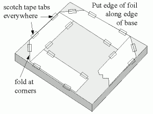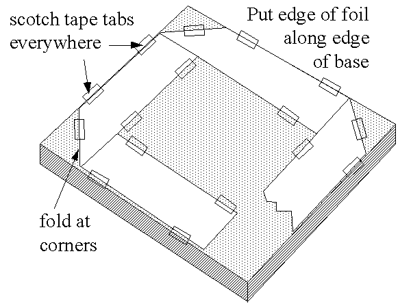 Fold the foil over itself as shown. Use tabs of scotch tape to hold the foil in place. Continue taping it down on three, and part of the fourth, side: