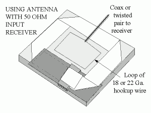 If you use a table model receiver (or an amateur transceiver,) make a single turn loop of about #18 insulated hookup wire by taping the wire in place one inch inside the foil loop. Bring the wire away from the antenna on the middle of the side opposite the tuner. Don’t connect this loop to the foil – it isn’t necessary.