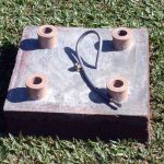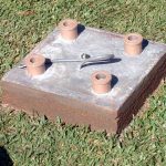 Four (4) sections of weldable PVC (brown core), 50 mm in diameter have been used, with 60 cm of length embedded in the center of the concrete base and on the exterior tips (80 mm) two reducer unions have been joined with “TIGRE” PVC glue.