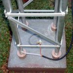 The support insulator was buried to the soil with concrete (cement, rock dust, and 20mm stone aggregate at ratio of 1:4:4) in a squared hole of 40 cm width and 80 cm deep. In the deep end of the hole four linked 2.4 m copperweld poles had been inserted and interconnected with 25 mm2 flexible cable so they will be part of the grounding.