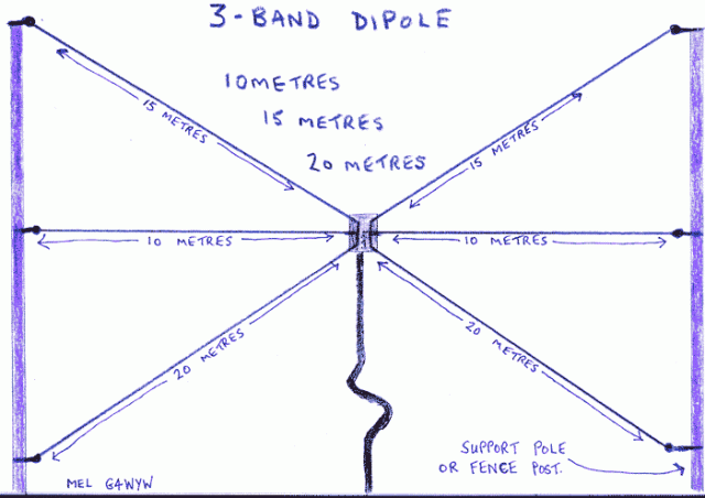 First, please excuse my artistic abilities. The diagrams are basic but show the rudiments of this excellent aerial, which is ideal for the newcomer to HF and those on a small budget as well as those with little space to erect large arrays!