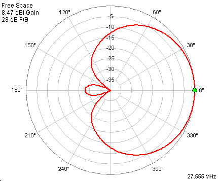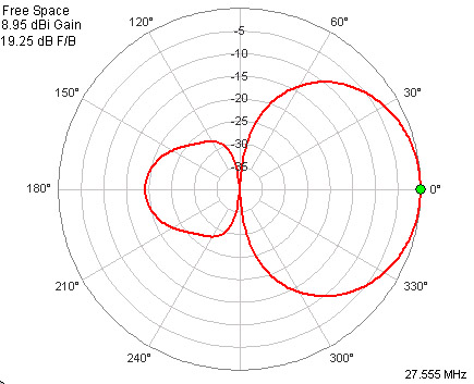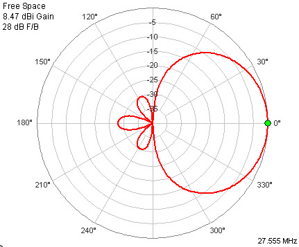 This antenna was design to be operated in the horizontal position (producing horizontal polarization). All the above paragraphs describing antenna performance are strictly referring to this design in the horizontal position. This is the most common polarization used by DXers . The pattern of this design in the vertical position is shown in Figure 8. I display this pattern here just to show the difference that occurs if the Yagi is operated in the vertical position. No attempt whatsoever was made to optimize this antenna in the vertical position. You can see there is a *huge* change in the pattern when the antenna is operated in the vertical position – this fact is rarely pointed out in books on antennas for DXing because they all assume the horizontal position will be used. This is not always true on the 11 meter CB band. The 4 element Yagi in the horizontal position does provide better all around F/R (“rejection”) than it does in the vertical position. Again, I wouldn’t recommend you switch to my design over your current design if you need to use it in the vertical position – I can’t promise better performance.