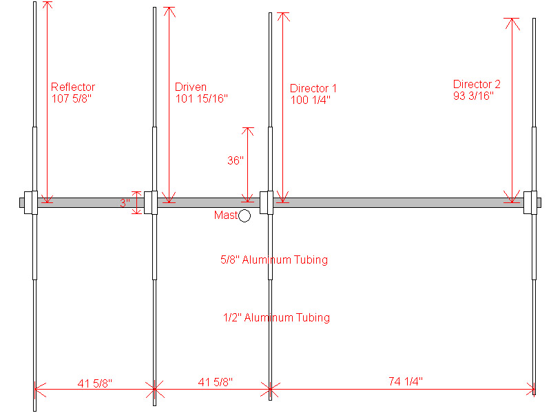 Here is the owners manual for the MaCo 4 element Yagi M104C : http://www.majestic-comm.com/assembly/SUPPORT/M104C.PDF. The owners manual gives all the stock dimensions of the antennas and shows assembly detail.