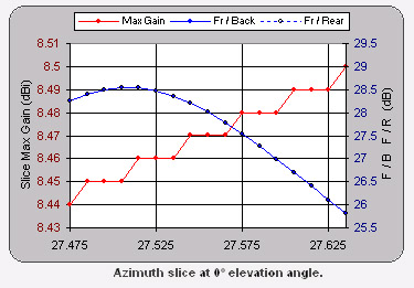 Frequently the freeband operator takes a beam antenna made for the regular CB channels (26.965Mhz – 27.405Mhz) and uses the dimensions straight from the owners manual. Then the gamma match is adjusted for the best SWR on the frequency of interest. This results in very poor “rejection”, because the beam antenna is being operated so far off its designed center frequency (see Figure 3). This is one reason so many people have resorted to money making snake oil fixes on their beams, such as extra “rejection wires”. The correct fix is to rescale (actually remodeled) the antenna design on the computer for the new center design frequency to insure a useable F/B ratio over the new operating range. Figure 4 shows the performance data for the M104C operating on the “freeband”.