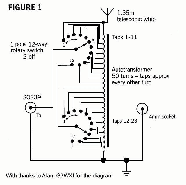 Trawling through the Internet I discovered an article by Robert Victor, VA2ERY, who described his investigations with an autotransformer, as a solution to achieving multiband, QRP, portable, HF operations. Briefly, he describes methods of transforming impedance, using a transformer rather than a loading coil to match a short whip over a wide range of frequencies. The autotransformer may be considered as a double wound transformer; the bottom, primary part being connected to the rig, whilst the secondary is connected to the whip. The impedance transformation is the square of the ratio between the secondary and primary windings. The tapping point varies the ratio between the secondary and primary windings and establishes an impedance transformation. The article can be read in full in QST, July 2001 © ARRL.