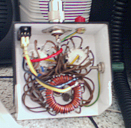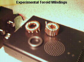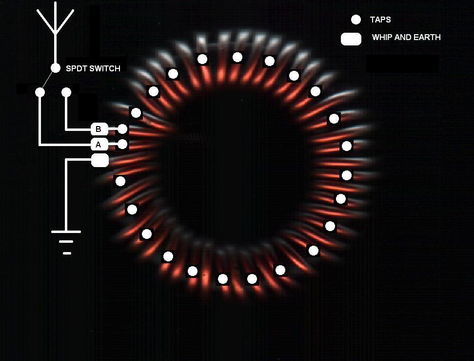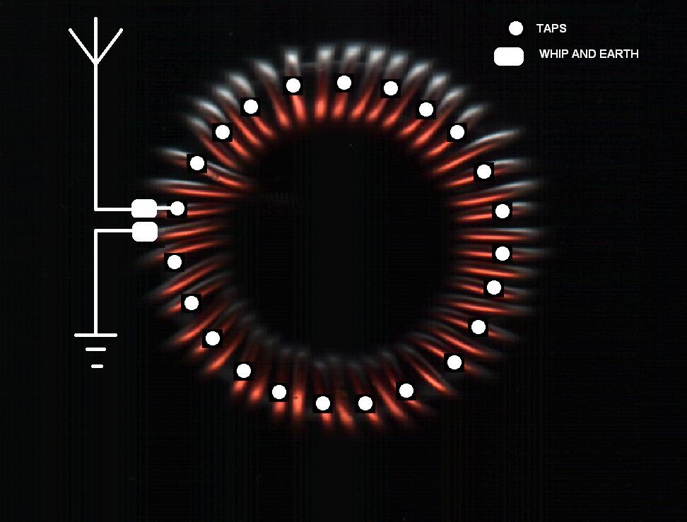 Using VA2ERY’s autotransformer concept as a starting point, I experimented with a compromise design which would allow me incremented tuning (rather than continuously variable), with the advantage of less rigorous mechanical complexity. After some experimentation (trial and error) my final design employs a 36mm outside diameter, ferrite ring and is wound with 48 turns of either 16, 18 or 20 gauge copper wire. The core is tapped at every second turn. Fine adjustment is achieved by altering the length of the whip.