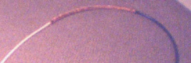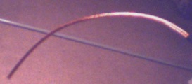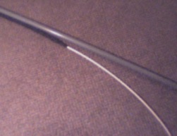 Now cut along the coax making a lengthwise slit in the outer jacket until you get to the end. Again be very careful not to slice the braid. Removing this section of jacket will expose the braid as shown on the left.