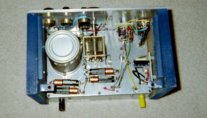 The tuning coil is wound with approximately AWG 18 enameled magnet wire on a cross-linked polyethylene (PEX) cylindrical form. Each end of the winding is passed through two holes drilled in the form with approximately ½ inch of protruding magnet wire scraped clean of insulation. These two bare copper ends serve as terminals for the coil. The coil is mounted on the chassis deck with small angle brackets, machine screws and nuts. The tuning coil, mounted above the chassis is shielded by an empty steel food can. Stability of this receiver’s tuned circuit is enhanced by very slightly compression loading the coil form by making it very slightly longer than the shield can. The angle brackets on the shield can are located just above the raised “lip” on the lower edge of the(empty soup) can so that tightening these screws compression loads the coil form. Spacing between the coil, chassis deck and shield can follows the guidelines in the 1992 ARRL handbook for shielded inductors.