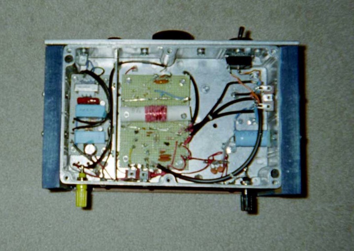 The receiver was built on a diecast aluminum chassis with a rubber “foot” at each corner. The chassis wall thickness is 0.075 inch. The RF circuit board is held above the inside bottom surface of the chassis with machine screws and nylon spacers. Main or coarse tuning is accomplished with a high quality 140 pF anodized variable capacitor bought on Ebay driven by an Argonne AR-404 Vernier drive also bought on ebay. Fine tuning is done with a “floating rotor” variable capacitor driven by a small Vernier drive. The floating rotor tuning capacitor has two fixed aluminum plates separated by an air gap. An aluminum rotor held and driven by a small Vernier drive moves in and out between these fixed plates varying the capacitance as it moves. The overall capacitance change from “rotor in” to “rotor out” is on the order of 0.1 pF, but this capacitance change is more than enough to tune completely through a received signal. The floating rotor capacitor is very good for tuning precisely to the center of a received AM signal. Its location close to the very fine regeneration control makes it easy to tune and optimize a weak signal. The receiver front panel is 1/8 inch thick aluminum which qualifies as “plate” rather than “sheet”. The thickness of the front panel complicates construction because not all potentiometers have long enough threaded bushings for such a thick panel. Also, the die cast chassis has sloping sides which make it necessary to mount some components to the front panel rather than the chassis. Most of the radio frequency circuitry is under the chassis deck. There are two 3/4 inch thick wooden “end pieces” bolted to the diecast chassis. These serve to damp any vibration of the chassis and front panel. The audio amplifier/driver is located under the chassis deck and is isolated from the RF circuits by an aluminum shield partition. This partition has through holes for interconnecting wires and cables to pass. There is a jfet source follower immediately following the 1N34 bridge detector. This circuit uses a miniature audio transformer to provide some voltage gain.