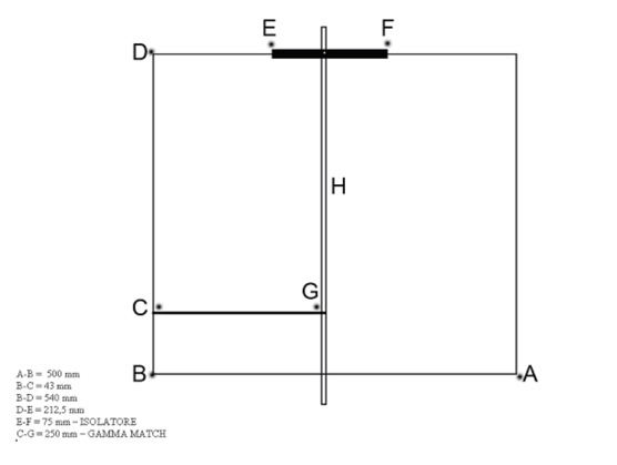 Based on a commercial model, it was reproduced using aluminum tubes from 4 and 6 mm (sold in DIY stores). The boom (H) is made with an aluminum profile 10/10 mm square section. If you are using anodized aluminum, remember that it should be grinding to all points of contact for an improved electrical conduction.