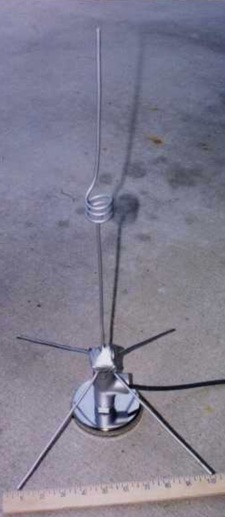 The antenna is an atypical vertical: instead of the common 1/4 wl vertical monopole or 14/ wl ground plane with 1/4 wl radials, this design employs a 3/8 wl vertical section and short radials to complete the “ground plane.” Effectively, an off-center-fed vertical dipole that does not rely on the earth or, in my case the truck body, to complete the bottom half of the antenna.