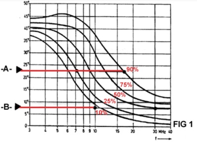 See Figure 1. At a Radiation Angle of 23 Degrees (See Fig. 1A) your “DX-chance” at 7 MHz is 25%, while at 18 MHz it is 90%. At a Radiation Angle of 7 Degrees (See Fig. 1B) your “DX-chance” at 10 MHz is 10%, while at 30 MHz it is 50%.