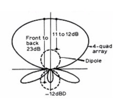 Fig 2. Horizontal radiation pattern of quadruple quad compared to a dipole (VHF Communications May 1971).