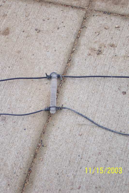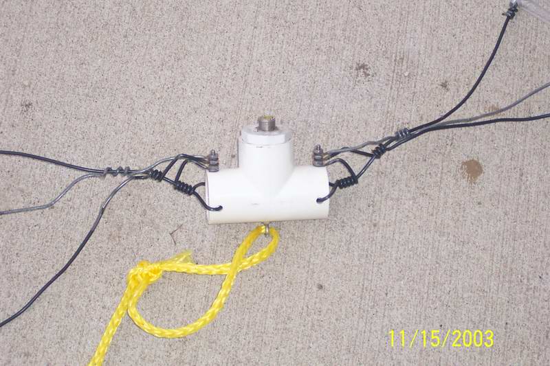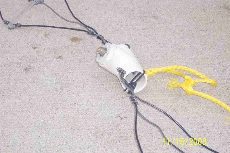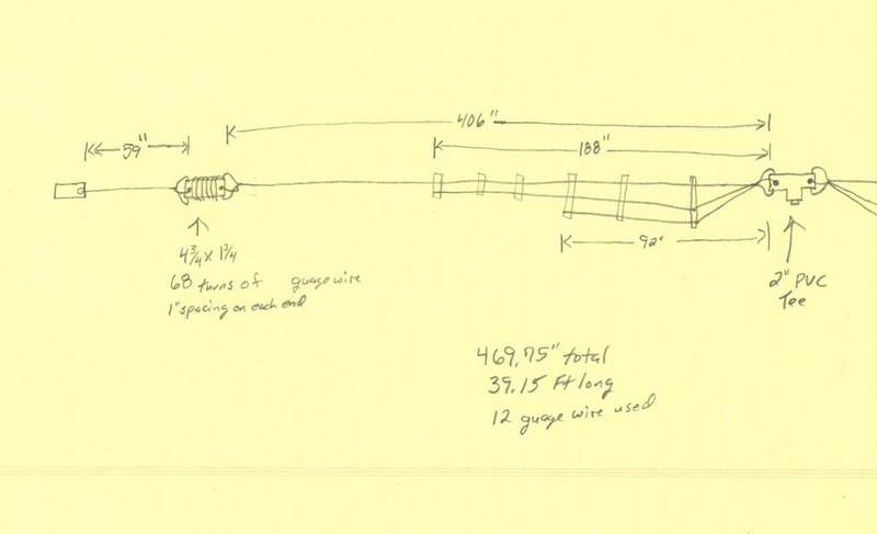 The 160 leg is 56″ long and made of 14 gauge insulated wire. The coil is 2″ O.D. and 10″ long PVC. There are around 120 winds of 20 gauge wire and start 2″ from the end. They are similar to the 80m coil for holes and hardware to attach wires.