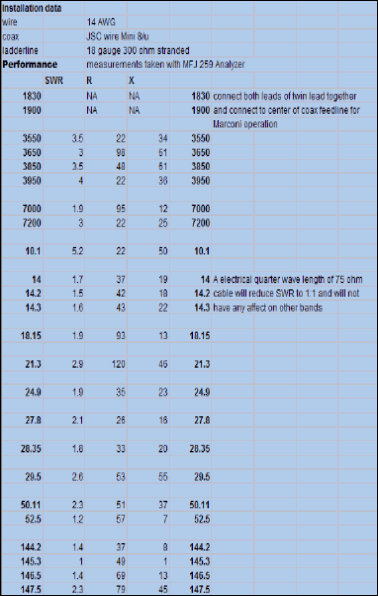 Table 1 – Measured performance of the W5GI Mystery Antenna at various frequencies. Columns list frequency, SWR (all as a ratio to 1), Resistance (R) in ohms, and Reactance (X) in ohms.