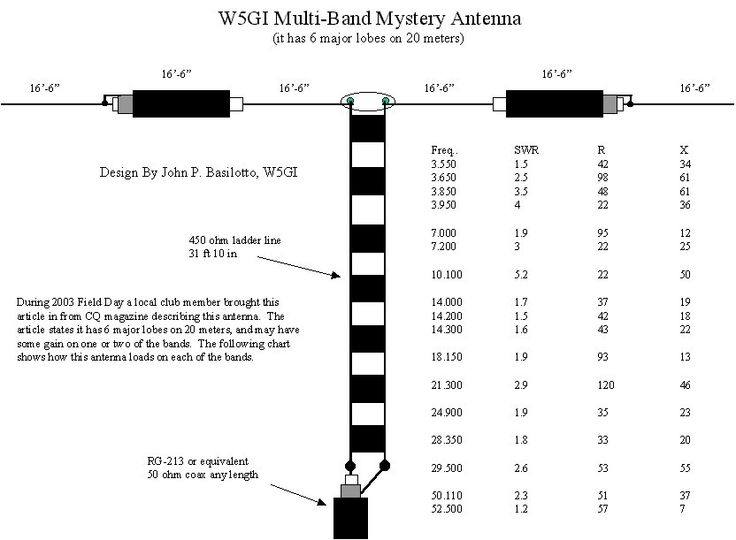 Well I tried to build me one of these mystery antennas and it dont work and has a very high SWR. I have built many diapoles and this does not work like the design I have says so. The design I have says as followed: Cut 4 sections of 14 guage electrical wire at 16’6″ and 2 sections of RG8X coax. Then solder the inner section of 14 guage wire to the center conductor of the RG8X coax wire. This end “does not” get the shield soldered to the 14 guage wire. The solder the outside end of the shield and center conductor to the 14 guage wire. The as the design claims to use a piece of 450 Ohm ladder line at 31′ 10″. and solder to the inner ends of the 14 guage wire (using a center insulator of course). And then solder your coax directly to the 450 Ohm ladder line. And according to the chart for this I should have an SWR on 20 meters of about 1.5. My SWR is 3.5. I went over this antenna many times to figure this out and its got me stumped. And yes I do have it mounted right and away from all metal objects and its about 35 feet or so up at the apex. If anyone has any sugestions feel free to write me at my call sign at Yahoo.com….Thx…Mark (KD4QHG)