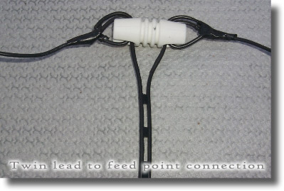 - Install the twin lead through the holes of the center insulator (you may have to enlarge the holes) and solder to antenna wire as shown in photo D below.